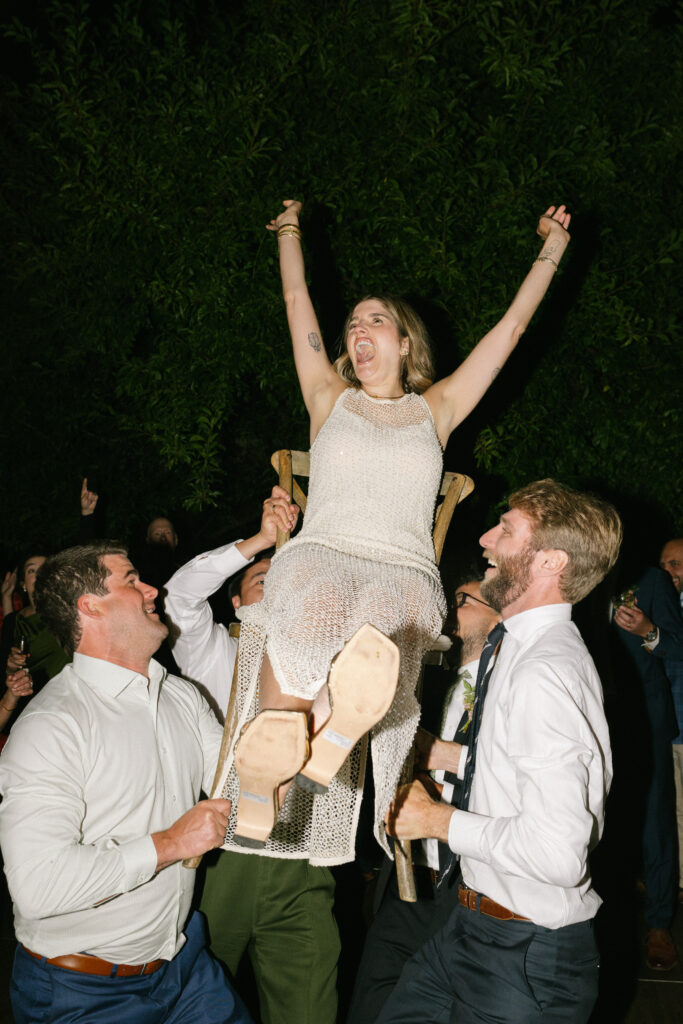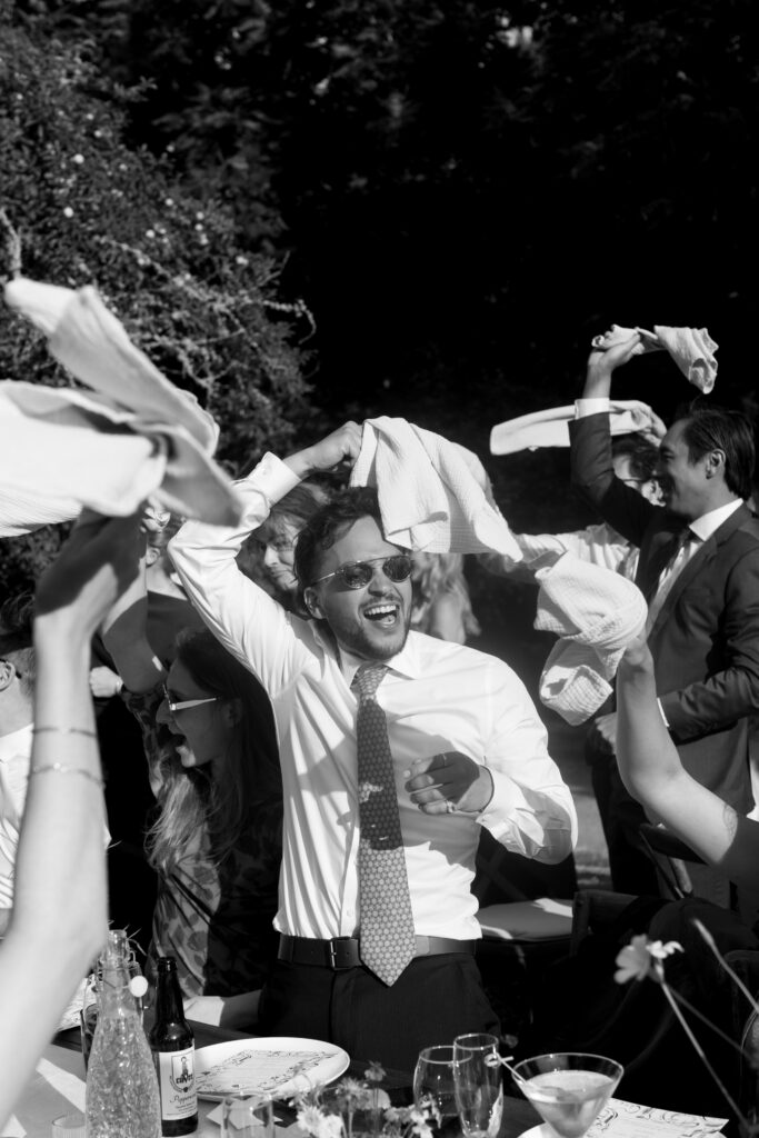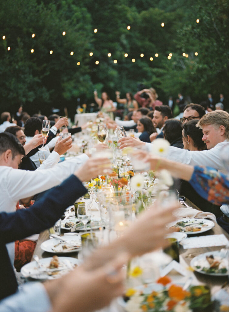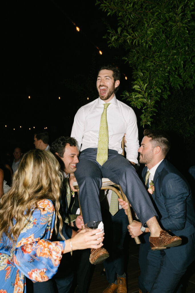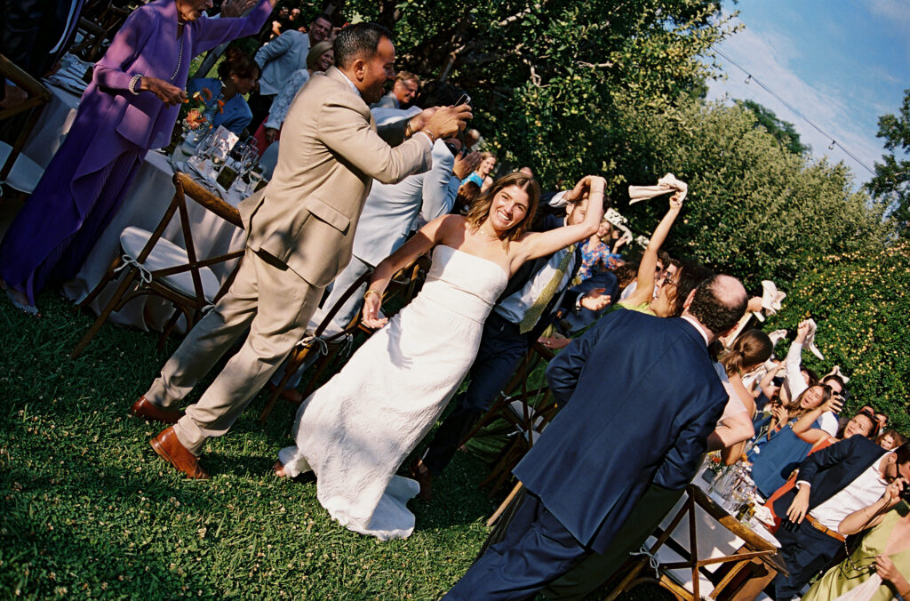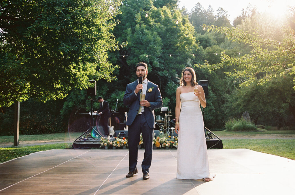 After a heartfelt ceremony beneath the redwood trees, the celebration jumped straight into a pre-dinner dance party (yes, before dinner), skipping the first dance and going all in on the collective joy. The Lucky Devils Band brought the energy, and the crowd matched it with moves and martinis in hand, just as Sara and Jesse had envisioned.
