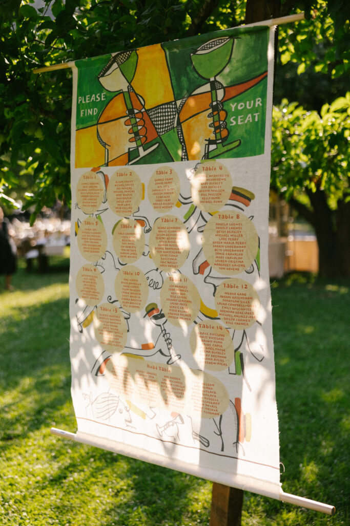 The aesthetic was elevated but approachable, layered with custom hand-drawn signage and artwork created by Jesse (the groom) himself. From the welcome signs to the bar menu to seating charts, every piece felt personal and intentional, adding depth and character to the space in a way only the couple could pull off.