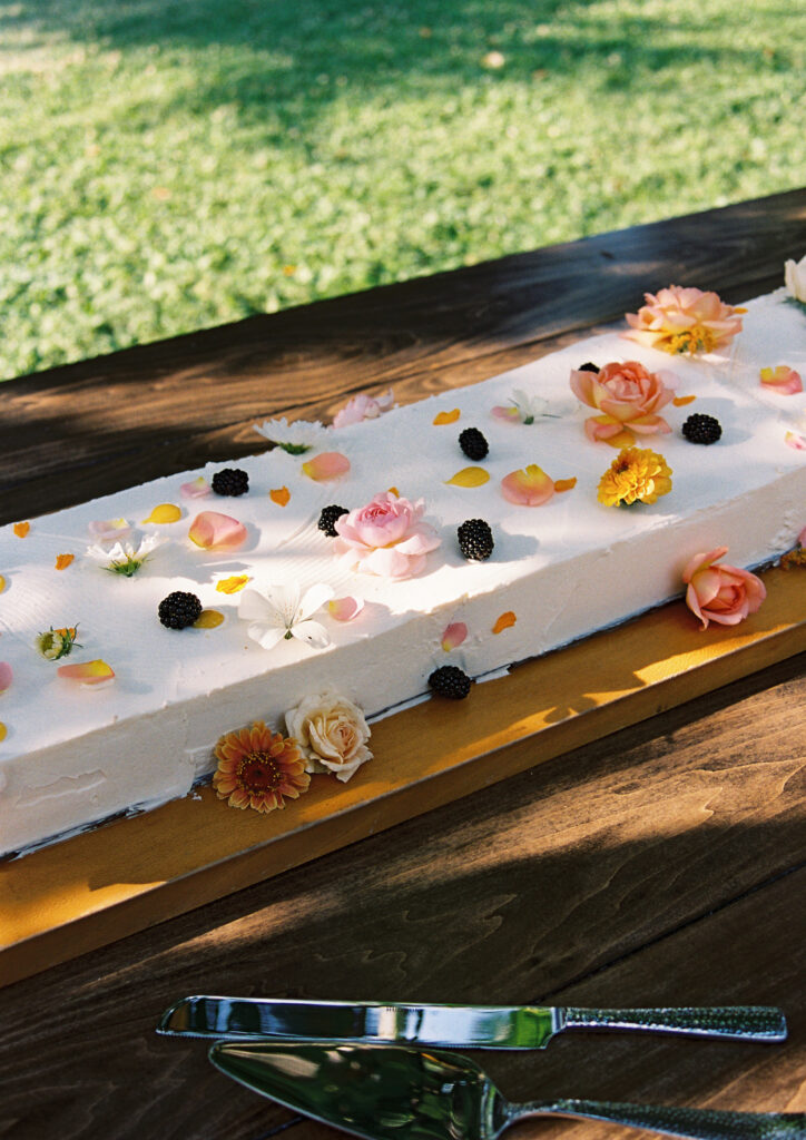 Once the energy settled into that golden hour glow, guests made their way to the dinner tables, where Dawn Ranch’s in-house culinary team served a meal that felt like the best version of a relaxed dinner party, seasonal, satisfying, and designed for long conversations. The cake by A Little Luster was a sweet, unfussy finish: beautiful, personal, and paired perfectly with one last cocktail.