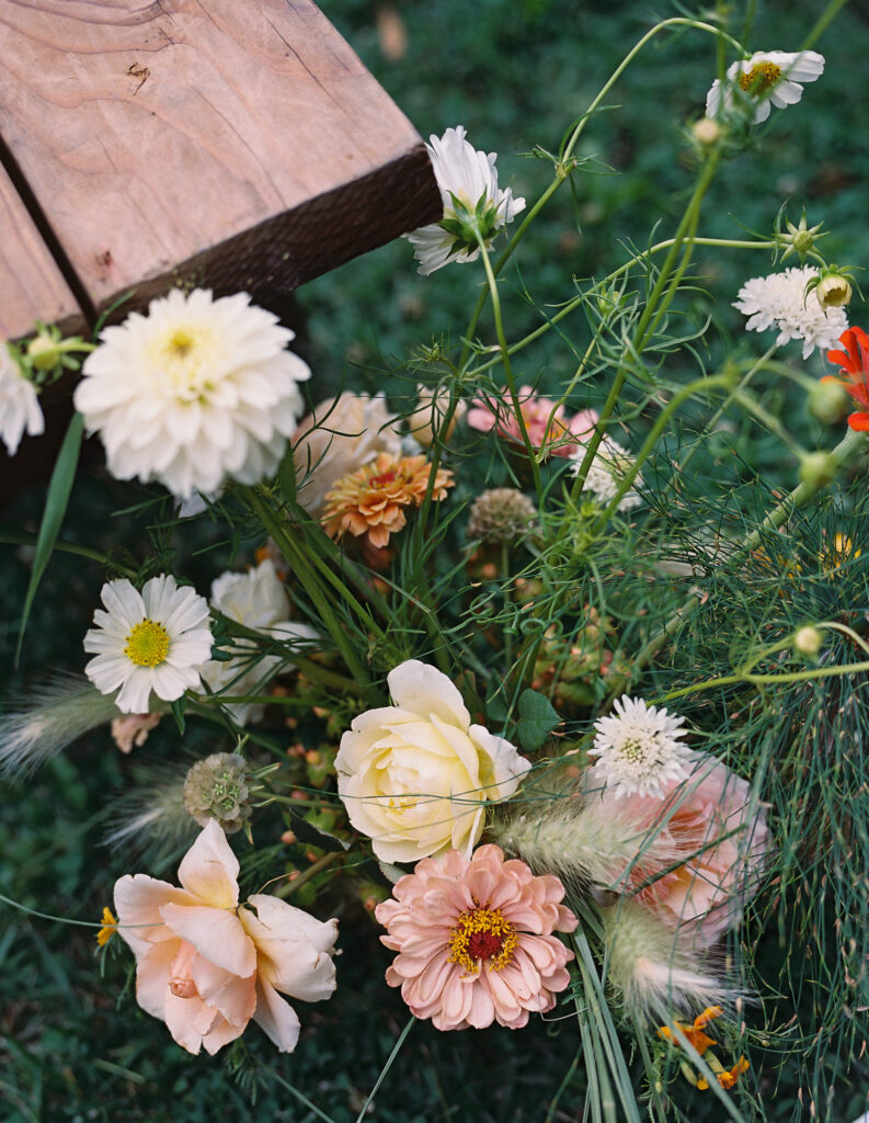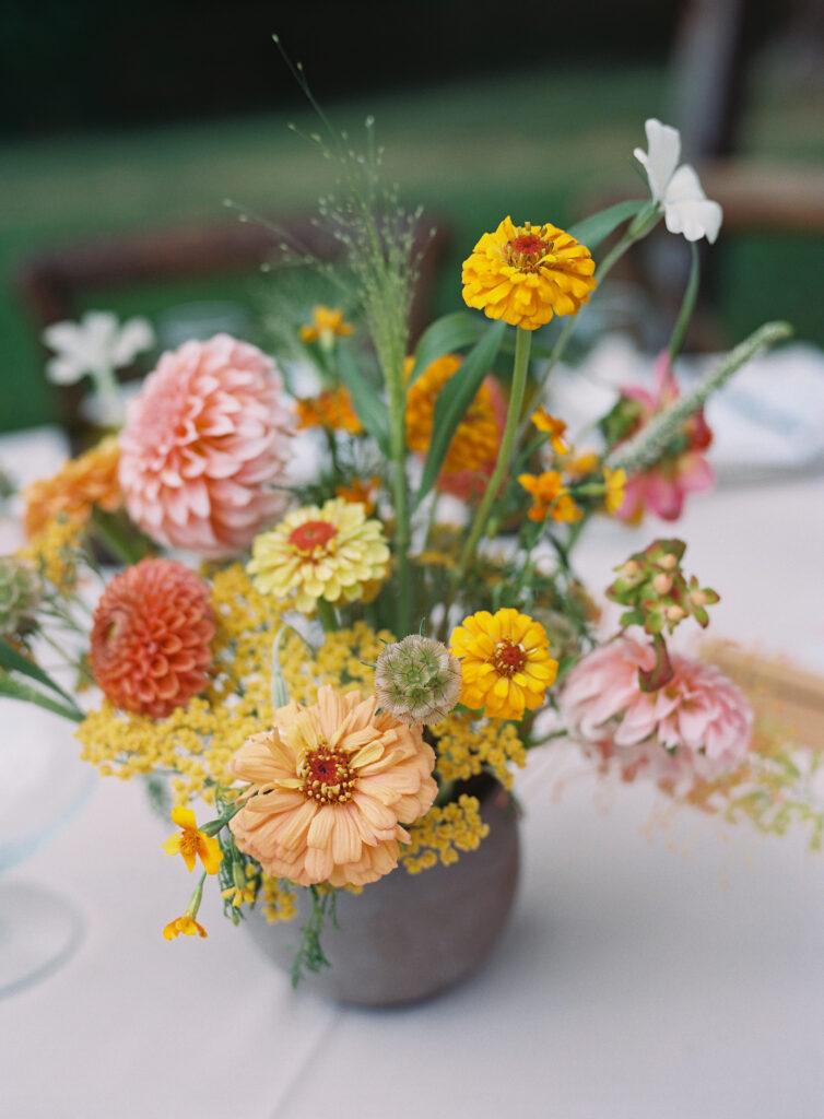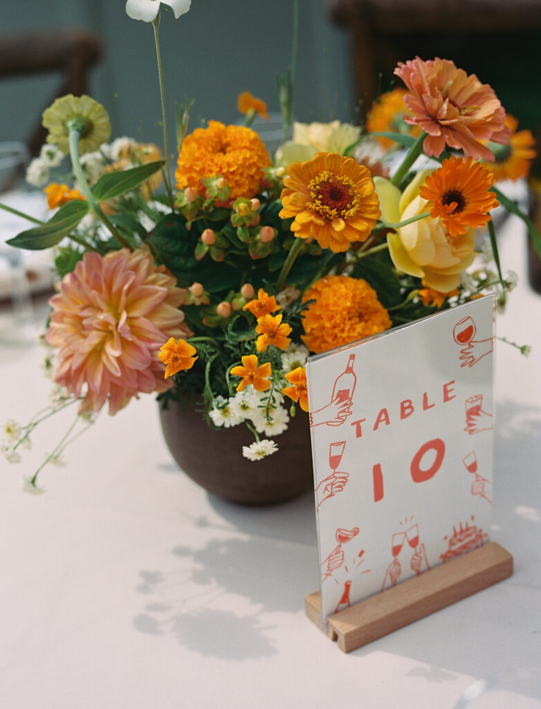 The design centered around Sara’s favorite colors, chartreuse and orange, woven into a base of linen, crushed stone, and natural woods. The result was a fresh, playful take on 1970s tones: warm, whimsical, and full of personality. Florals by Full Bloom Flower Farm brought the vision to life with wild, garden-style arrangements full of texture and unexpected color pairings, manzanilla olive, sunglow yellow, and vivid pops of citrus that made every corner feel joyful.